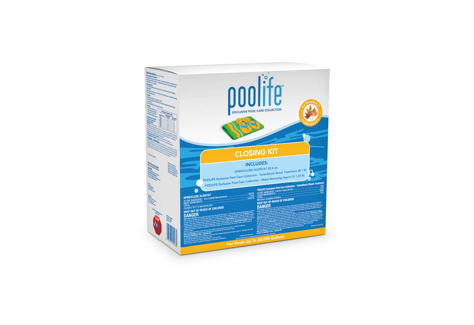 Follow full opening or closing directions of n the product label. To open Pool: Use 1 kit per 20,000 gallons of water. Prepare your filter and circulation system for opening and run the filter for 8 hours at a minimum. Test and balance the water chemistry, then add both bottles of poolife® Open/Close Algistate through the skimmer then add the metal removing agent directly to the deep end of the pool and filter for 24-48 hours before adding poolife® Turboshock. Finally add poolife® Turboshock in the deep end of the pool with the filter running. Wait until pool has a 1-4 ppm free available chlorine level before entering the pool. Follow a normal maintenance routine. To Winterize: Use 1 kit per 20,000 gallons of water as follows: Once pool is balanced and the filter is running properly. Add both bottles of poolife® open/Close Algistate through the skimmer then add the metal removing agent directly to the deep end of the pool and filter for 24-48 hours before adding poolife® Turboshock. Finally add poolife® Turboshock in the deep end of the pool with the filter running. Circulate for 2-4 hours then winterize the filter and circulation system per manufacturers recommendations.